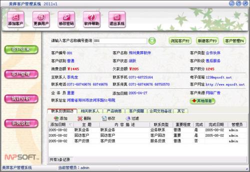 美萍客户管理系统是一款专业的客户关系管理软件(CRM管理系统),软件以客户为中心,把科学的管理与信息技术结合起来,实现市场、业务、服务协同工作统一管理。帮助企业规范业务流程、提高客户挖掘能力和客户服务质量、有效管理客户资源、提高业务成功率,达到全面提升企业核心竞争力的目的.软件界面设计简洁,美观,其人性化的软件流程,使普通用户不需培训也能很快掌握软件操作使用方法,上手极易。强大报表与集成查询功能是本软件的更大特色,所有功能在用户需要的使用地方自然体现,不用打开多个窗口重复查询。美萍客户关系管理系统广泛适用于各个行业进行客户管理,业务管理,是您企业进行客户档案管理,客户资料管理,客户服务管理,客户信息管理的强大工具