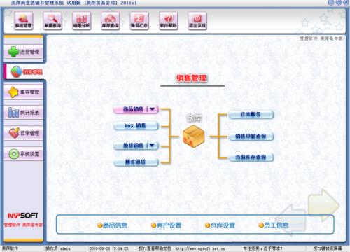 美萍商业进销存管理系统是一款专业的业务管理软件,其中包含商品业务管理系统 ,库存管理系统(仓库管理系统),财务和报表系统等子模块。软件界面设计简洁,美观,其人性化的软件流程,使普通用户不需培训也能很快掌握软件操作使用方法,上手极易。强大报表与集成查询功能是本软件的更大特色,所有功能在用户需要的使用地方自然体现,不用打开多个窗口重复查询。美萍进销存软件广泛适用于公司企业,商场,超市,门店等用于商业业务管理, 库存管理,财务管理等,客户管理,员工管理等场合,是您企业进行信息化管理的强大工具。